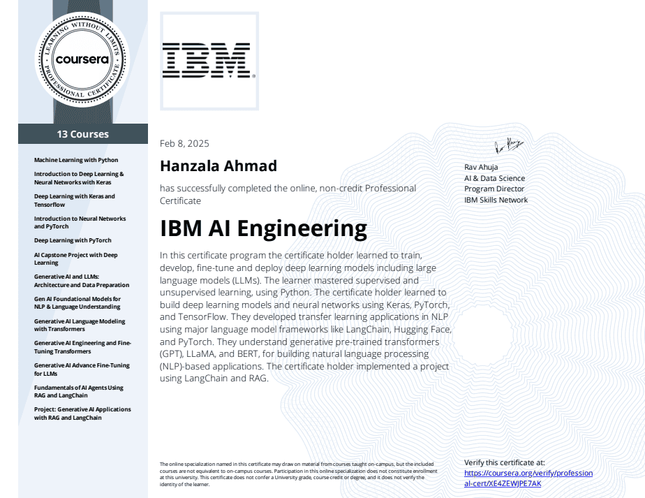 Comprehensive 13-course program covering Machine Learning with Python, Deep Learning, Neural Networks, Generative AI, and advanced AI/ML topics including LangChain and RAG.